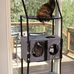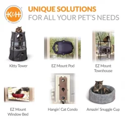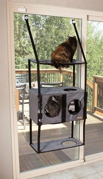 The K&H Pet Products EZ Mount Townhouse Cat Furniture measures 60โ in height and has similar features to the EZ Mount Stack. The difference is, this cat furniture has a spacious enclosed area that’s built right in for purr-ivacy. Simply install it on a sliding glass door or large picture window by using the provided suction cups. That’s right, there are no tools required for installation! This piece of cat furniture accommodates multiple feline friends for endless fun. Plus, it folds up so window blinds and drapery can function normally!