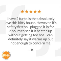 This sturdy Thermo-Kitty Sleephouse is made with MicroSuede and soft fleece. This heated Sleephouse has hard plastic walls that stand the test of time. Kitties can sleep inside or rest on top. Zips apart and lays flat for shipping and storage! Indoor use only. MET listed.