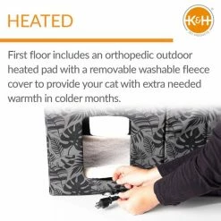 Give your kitty her very own abode with the K&H Pet Products Heated Two-Story Kitty House. This kitty house includes two bedrooms with four removable door flaps, and a cat dining room. The dining room has a removable roof so that you can treat your feline friend to food and water, and a large doorway for your cat to enter and exit. The second floor has space for a kitty roommate, and also has a great view. The house is made with a nylon and vinyl-backed fabric to help shield your cat from harsh weather, and the first floor includes a cozy fleece pad. Plus, no tools are required for assembly!