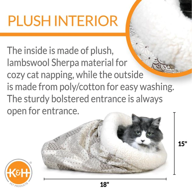 This playful bed is available in 1 size and 2 colors. The Crinkle Sack is a fun place to hide, peek or just take a nap. The sack makes the noise of a paper bag that all kitties love. The inside is lined with plush lambswool Sherpa. The outside is covered in poly/cotton for easy washing. Cats will play and be amused for hours and this will become one of the favorite hiding places.