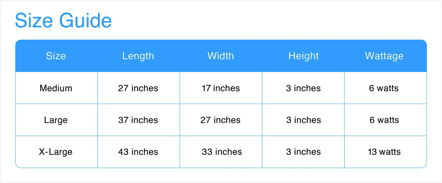 | X-Large | 43 inches | 33 inches | 3 inches | 13 watts |