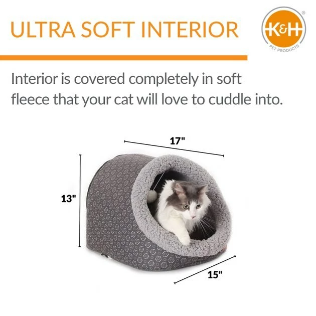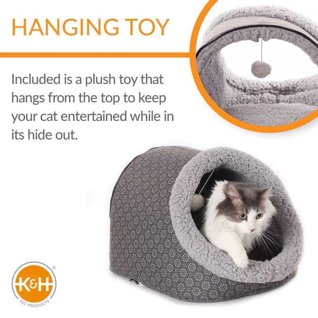 Give your feline friend a cozy place to snooze with the K&H Pet Products Unheated Thermo Cat Cave. This cat bed features a back door, which can be left unzipped for a tunnel shape or zipped up to form a cave shape. The bed is crafted with a plush polyester exterior and a toasty fleece interior to help keep your kitty comfy during cat naps. Itโs made with foam walls to help the bed hold its shape, and even features a hanging plush toy for added playtime fun.