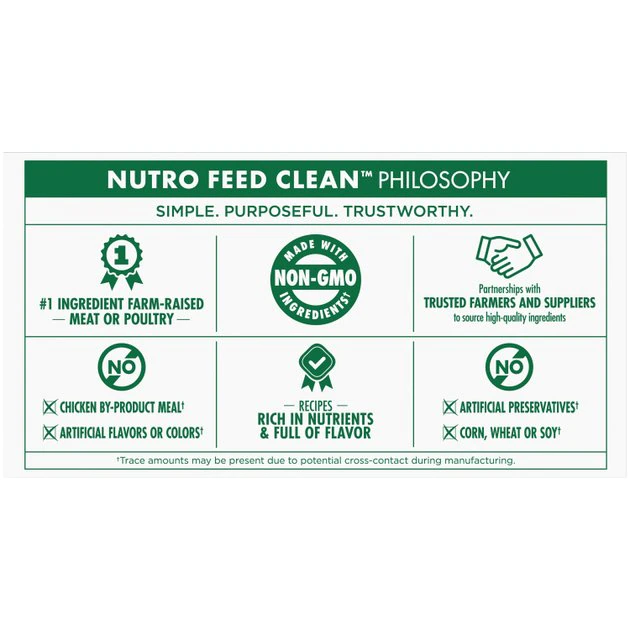 NUTRO always recommend using a transition period when introducing any new wet or dry food to your dog or cat. Mix 25% of the new food in with 75% of the current food. Over a 5-10 day period, gradually increase the amount of new food in the mixture until it’s the only thing in the bowl.