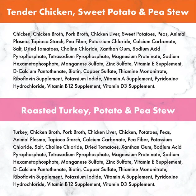 Tender Chicken, Sweet Potato & Pea Stew: Chicken, Chicken Broth, Pork Broth, Chicken Liver, Sweet Potatoes, Peas, Animal Plasma, Tapioca Starch, Pea Fiber, Potassium Chloride, Calcium Carbonate, Salt, Dried Tomatoes, Choline Chloride, Xanthan Gum, Sodium Acid Pyrophosphate, Tetrasodium Pyrophosphate, Magnesium Proteinate, Sodium Hexametaphosphate, Manganese Sulfate, Zinc Sulfate, Vitamin E Supplement, D-Calcium Pantothenate, Biotin, Copper Sulfate, Thiamine Mononitrate, Riboflavin Supplement, Potassium Iodide, Vitamin A Supplement, Pyridoxine Hydrochloride, Vitamin B12 Supplement, Vitamin D3 Supplement.