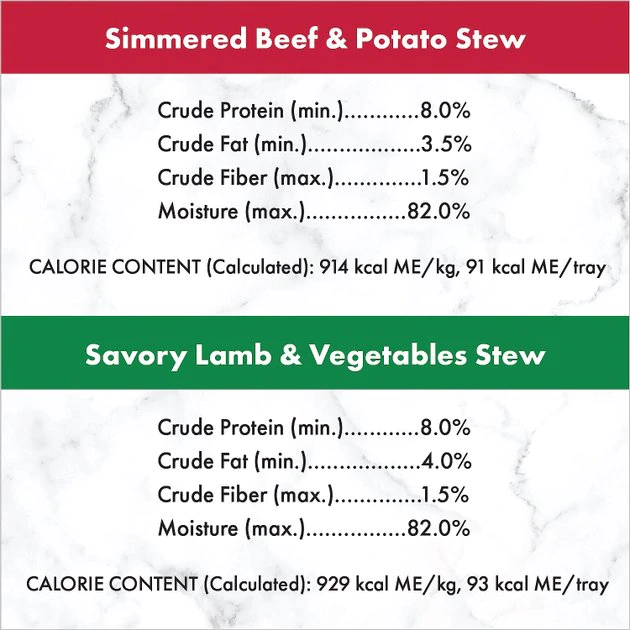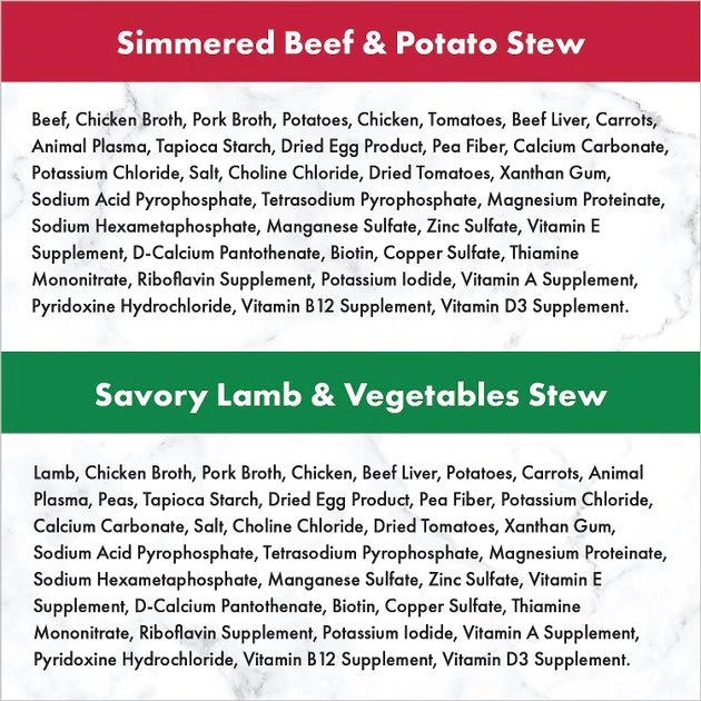 Simmered Beef & Potato Stew: Beef, Chicken Broth, Pork Broth, Potatoes, Chicken, Tomatoes, Beef Liver, Carrots, Animal Plasma, Tapioca Starch, Dried Egg Product, Pea Fiber, Calcium Carbonate, Potassium Chloride, Salt, Choline Chloride, Dried Tomatoes, Xanthan Gum, Sodium Acid Pyrophosphate, Tetrasodium Pyrophosphate, Magnesium Proteinate, Sodium Hexametaphosphate, Manganese Sulfate, Zinc Sulfate, Vitamin E Supplement, D-Calcium Pantothenate, Biotin, Copper Sulfate, Thiamine Mononitrate, Riboflavin Supplement, Potassium Iodide, Vitamin A Supplement, Pyridoxine Hydrochloride, Vitamin B12 Supplement, Vitamin D3 Supplement.