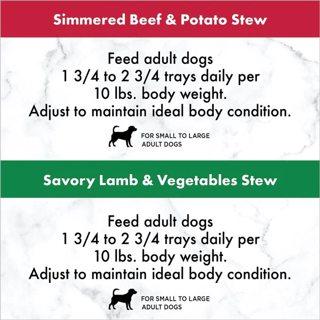 Feed adult dogs 1 3/4 to 2 3/4 trays daily per 10 lbs.
