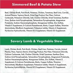 Savory Lamb & Vegetables Stew: Lamb, Chicken Broth, Pork Broth, Chicken, Beef Liver, Potatoes, Carrots, Animal Plasma, Peas, Tapioca Starch, Dried Egg Product, Pea Fiber, Potassium Chloride, Calcium Carbonate, Salt, Choline Chloride, Dried Tomatoes, Xanthan Gum, Sodium Acid Pyrophosphate, Tetrasodium Pyrophosphate, Magnesium Proteinate, Sodium Hexametaphosphate, Manganese Sulfate, Zinc Sulfate, Vitamin E Supplement, D-Calcium Pantothenate, Biotin, Copper Sulfate, Thiamine Mononitrate, Riboflavin Supplement, Potassium Iodide, Vitamin A Supplement, Pyridoxine Hydrochloride, Vitamin B12 Supplement, Vitamin D3 Supplement.
