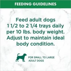 Feed adult dogs 1 1/2 to 2 1/4 trays daily for every 10 pounds of body weight. Adjust to maintain ideal body condition.