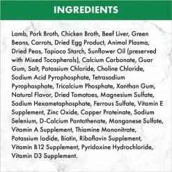 Lamb, Pork Broth, Chicken Broth, Beef Liver, Green Beans, Carrots, Dried Egg Product, Animal Plasma, Dried Peas, Tapioca Starch, Sunflower Oil (preserved with Mixed Tocopherols), Calcium Carbonate, Guar Gum, Salt, Potassium Chloride, Choline Chloride, Sodium Acid Pyrophosphate, Tetrasodium Pyrophosphate, Tricalcium Phosphate, Xanthan Gum, Natural Flavor, Dried Tomatoes, Magnesium Sulfate, Sodium Hexametaphosphate, Ferrous Sulfate, Vitamin E Supplement, Zinc Oxide, Copper Proteinate, Sodium Selenium, D-Calcium Pantothenate, Manganese Sulfate, Vitamin A Supplement, Thiamine Mononitrate, Potassium Iodide, Biotin, Riboflavin Supplement, Vitamin B12 Supplement, Pyridoxine Hydrochloride, Vitamin D3 Supplement.
