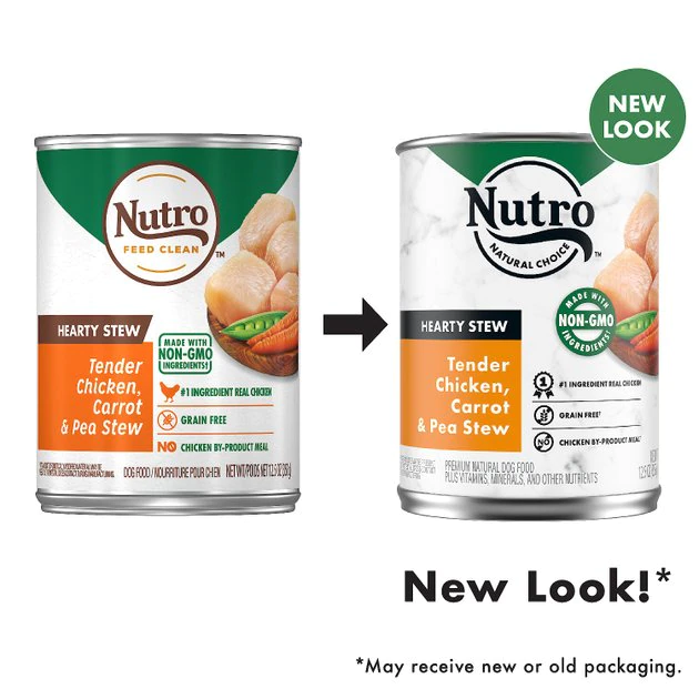 Watch your dog drool with delight over these Nutro Hearty Stew Tender Chicken, Carrot & Pea Stew Grain-Free Canned Dog Food. This premium wet dog food is full of nutrients and flavor that dogs—big and small—go crazy over. Each high-protein meal is balanced with vitamins and minerals and crafted with real chicken as the very first ingredient. Plus, with Nutro, you can feed your pal with confidence knowing that every ingredient is carefully sourced from a trusted network of farmers and suppliers and is 100% free of grains. gmos, chicken by-product meal, corn, soy, wheat, artificial colors, flavors or preservatives. Give your pal the nutrition he deserves and the taste he loves with Nutro.