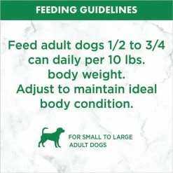 Feed adult dogs 1/2 to 3/4 cans daily per 10 lbs. body weight. Adjust to maintain ideal body condition.