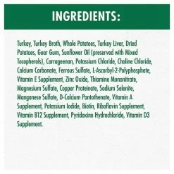 Turkey, Turkey Broth, Whole Potatoes, Turkey Liver, Dried Potatoes, Guar Gum, Sunflower Oil (preserved with Mixed Tocopherols), Carrageenan, Potassium Chloride, Choline Chloride, Calcium Carbonate, Ferrous Sulfate, L-Ascorbyl-2-Polyphosphate, Vitamin E Supplement, Zinc Oxide, Thiamine Mononitrate, Magnesium Sulfate, Copper Proteinate, Sodium Selenite, Manganese Sulfate, D-Calcium Pantothenate, Vitamin A Supplement, Potassium Iodide, Biotin, Riboflavin Supplement, Vitamin B12 Supplement, Pyridoxine Hydrochloride, Vitamin D3 Supplement.