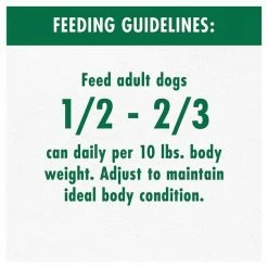 Feed adult dogs 1/2 to 2/3 can daily per 10 lbs. body weight. Adjust to maintain ideal body condition.
