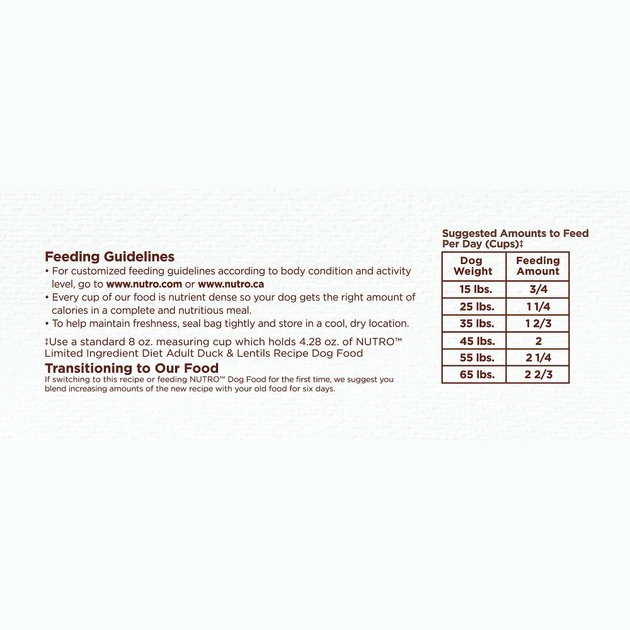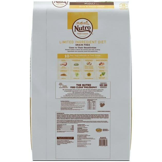 Nutro Limited Ingredient Diet Sensitive Support with Real Duck & Lentils Grain-Free Adult Dry Dog Food is paw-fect for pups with certain food sensitivities! Formulated with just 10 key, natural ingredients or less, Nutroโs Limited Ingredient Diet Sensitive Support recipes are made without ingredients that commonly cause food sensitivities in pets, like corn, wheat, soy, dairy protein, chicken and beef. This grain-free dog food is crafted with real ingredients, including duck and lentils. Not only does it deliver a taste that will get your dogโs tail to wag, but it also nourishes sensitive skin from the inside out, promoting a soft, shiny coat. And you can feel extra good knowing that this dry dog food follows the Nutro Feed Clean philosophy, so itโs made with non-GMO ingredients and zero artificial flavors colors or preservatives. Please note that trace amounts of genetically modified material might be present due to potential cross contact during manufacturing.