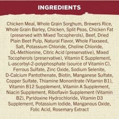 Chicken Meal, Whole Grain Sorghum, Brewers Rice, Whole Grain Barley, Chicken, Split Peas, Chicken Fat (preserved with Mixed Tocopherols), Beef, Dried Plain Beet Pulp, Natural Flavor, Whole Flaxseed, Salt, Potassium Chloride, Choline Chloride, DL-Methionine, Citric Acid (preservative), Mixed Tocopherols (preservative), Vitamin E Supplement, L-ascorbyl-2-polyphosphate (source of Vitamin C), Ferrous Sulfate, Zinc Oxide, Sodium Selenite, D-Calcium Pantothenate, Biotin, Manganese Sulfate, Copper Sulfate, Thiamine Mononitrate (Vitamin B1), Vitamin B12 Supplement, Vitamin A Supplement, Niacin Supplement, Riboflavin Supplement (Vitamin B2), Pyridoxine Hydrochloride, Vitamin D3 Supplement, Potassium Iodide, Manganous Oxide, Folic Acid, Rosemary Extract