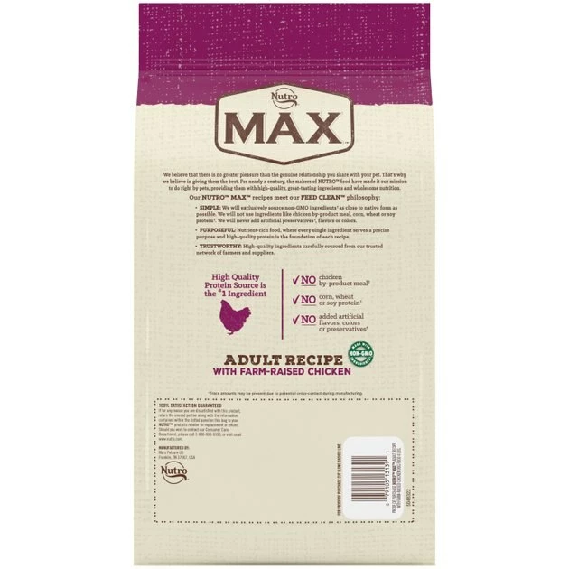 Do right by your dog with Nutro Max Adult Farm Raised Chicken Recipe Natural Dry Dog Food. This scrumptious kibble features farm-raised chicken as the number one ingredient. Each nutritious bite contains natural fiber to aid in healthy digestion and omega fatty acids to support soft skin and a shiny coat. Plus, the crunchy texture helps clean your dog’s teeth as they chew. With every bowl of Nutro Max, you can trust that your loyal canine companion is getting the nutrition they deserve to help them live a full, healthy life. Proudly made in the USA using the world’s finest non-GMO ingredients.