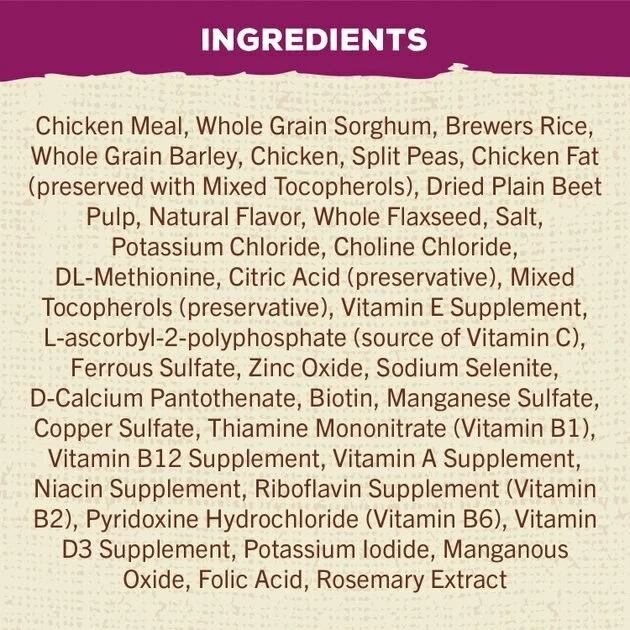 Chicken Meal, Whole Grain Sorghum, Brewers Rice, Whole Grain Barley, Chicken, Split Peas, Chicken Fat (preserved with Mixed Tocopherols), Dried Plain Beet Pulp, Natural Flavor, Whole Flaxseed, Salt, Potassium Chloride, Choline Chloride, DL-Methionine, Citric Acid (preservative), Mixed Tocopherols (preservative), Vitamin E Supplement, L-ascorbyl-2-polyphosphate (source of Vitamin C), Ferrous Sulfate, Zinc Oxide, Sodium Selenite, D-Calcium Pantothenate, Biotin, Manganese Sulfate, Copper Sulfate, Thiamine Mononitrate (Vitamin B1), Vitamin B12 Supplement, Vitamin A Supplement, Niacin Supplement, Riboflavin Supplement (Vitamin B2), Pyridoxine Hydrochloride (Vitamin B6), Vitamin D3 Supplement, Potassium Iodide, Manganous Oxide, Folic Acid, Rosemary Extract
