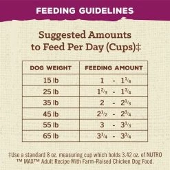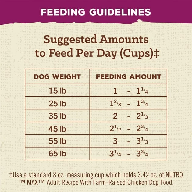 ‡Use a standard 8 oz. measuring cup which holds 3.42 oz. of NUTRO™ MAX™ Adult Recipe with Farm-Raised Chicken Dog Food.