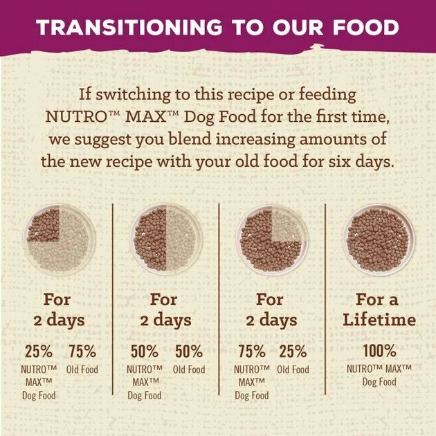 If switching to this recipe or feeding NUTRO™ MAX™ Dog Food for the first time, we suggest you blend increasing amounts of the new recipe with your old food for six days.