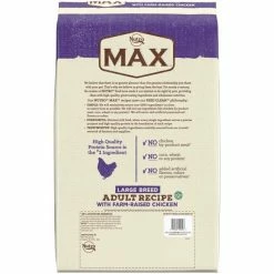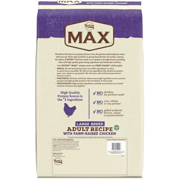 Treat your big boy to great-tasting nutrition with Nutro Max Large Breed Adult Farm-Raised Chicken Recipe Natural Dry Dog Food. This scrumptious kibble is specially formulated for the unique dietary needs of large breed dogs. Each bite is packed with real, farm-raised chicken. It also contains natural fiber to aid in healthy digestion and omega fatty acids to support soft skin and a shiny coat. Plus, the crunchy texture helps clean your dogโs teeth as he chews. With every bowl of Nutro Max, you can trust that your loyal canine companion is getting the nutrition he deserves to help him live a full, healthy life.