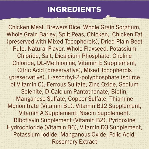 Chicken Meal, Brewers Rice, Whole Grain Sorghum, Whole Grain Barley, Split Peas, Chicken, Chicken Fat (preserved with Mixed Tocopherols), Dried Plain Beet Pulp, Natural Flavor, Whole Flaxseed, Potassium Chloride, Salt, Dicalcium Phosphate, Choline Chloride, DL-Methionine, Vitamin E Supplement, Citric Acid (preservative), Mixed Tocopherols (preservative), L-ascorbyl-2-polyphosphate (source of Vitamin C), Ferrous Sulfate, Zinc Oxide, Sodium Selenite, D-Calcium Pantothenate, Biotin, Manganese Sulfate, Copper Sulfate, Thiamine Mononitrate (Vitamin B1), Vitamin B12 Supplement, Vitamin A Supplement, Niacin Supplement, Riboflavin Supplement (Vitamin B2), Pyridoxine Hydrochloride (Vitamin B6), Vitamin D3 Supplement, Potassium Iodide, Manganous Oxide, Folic Acid, Rosemary Extract