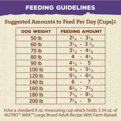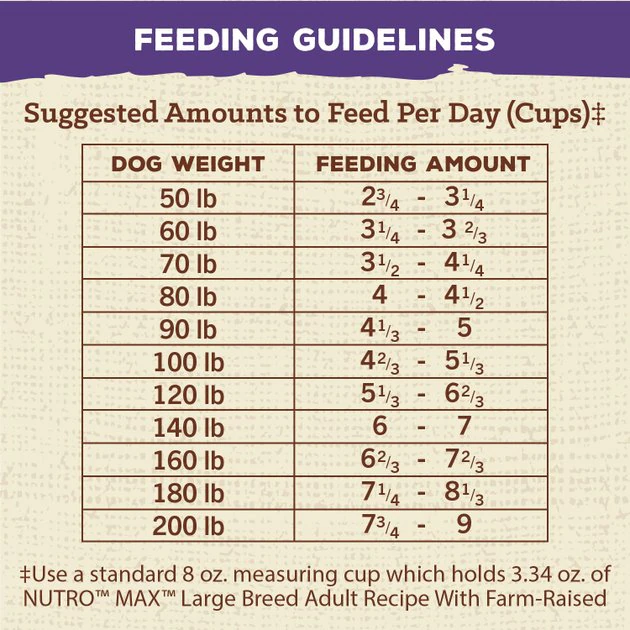 โกUse a standard 8 oz. measuring cup which holds 3.34 oz. of NUTROโข MAXโข Large Breed Adult Recipe with Farm-Raised Chicken Dog Food.
