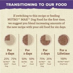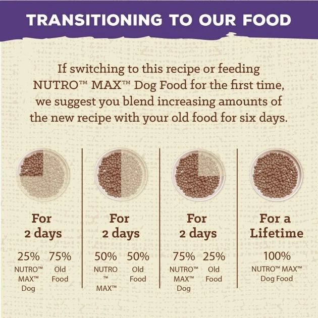 If switching to this recipe or feeding NUTROโข MAXโข Dog Food for the first time, we suggest you blend increasing amounts of the new recipe with your old food for six days.