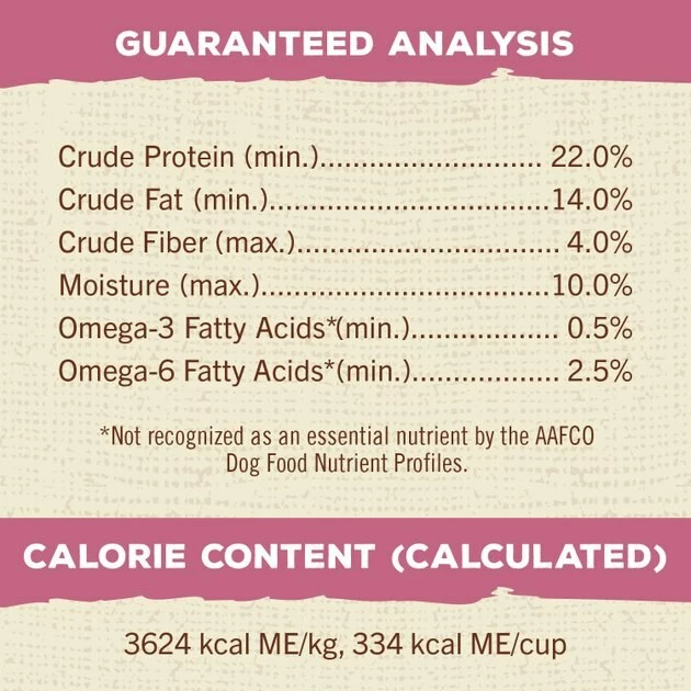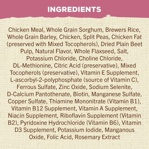 Chicken Meal, Whole Grain Sorghum, Brewers Rice, Whole Grain Barley, Chicken, Split Peas, Chicken Fat (preserved with Mixed Tocopherols), Dried Plain Beet Pulp, Natural Flavor, Whole Flaxseed, Salt, Potassium Chloride, Choline Chloride, DL-Methionine, Citric Acid (preservative), Mixed Tocopherols (preservative), Vitamin E Supplement, L-ascorbyl-2-polyphosphate (source of Vitamin C), Ferrous Sulfate, Zinc Oxide, Sodium Selenite, D-Calcium Pantothenate, Biotin, Manganese Sulfate, Copper Sulfate, Thiamine Mononitrate (Vitamin B1), Vitamin B12 Supplement, Vitamin A Supplement, Niacin Supplement, Riboflavin Supplement (Vitamin B2), Pyridoxine Hydrochloride (Vitamin B6), Vitamin D3 Supplement, Potassium Iodide, Manganous Oxide, Folic Acid, Rosemary Extract