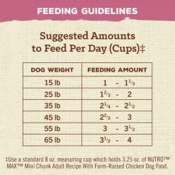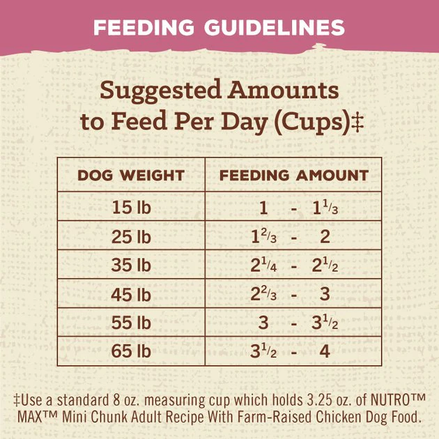 ‡Use a standard 8 oz. measuring cup which holds 3.25 oz. of NUTRO™ MAX™ Adult Mini Chunk Recipe with Farm-Raised Chicken Dog Food.