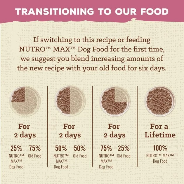 If switching to this recipe or feeding NUTRO™ MAX™ Dog Food for the first time, we suggest you blend increasing amounts of the new recipe with your old food for six days.