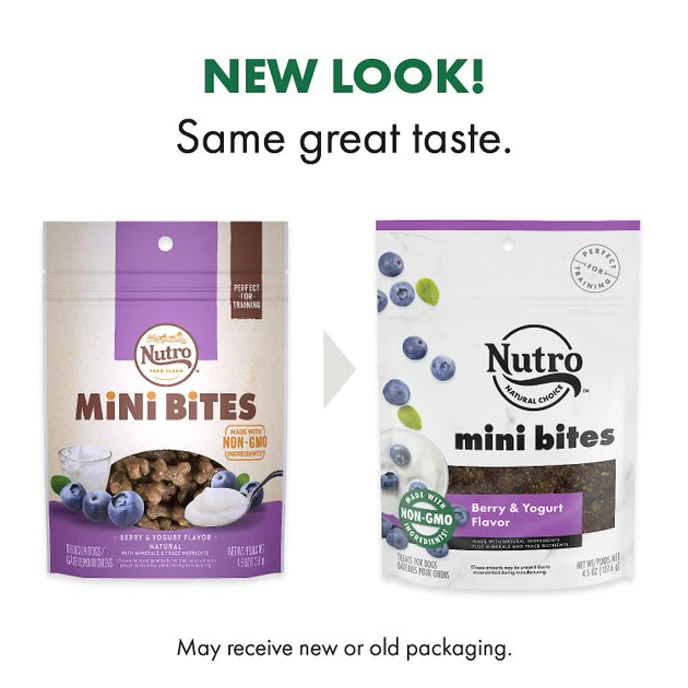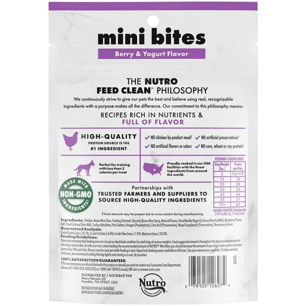 Feed your dog’s healthy and active lifestyle with Nutro Mini Bites Berry & Yogurt Flavor Dog Treats. These protein-first, zero-grain treats are made with real, high-quality chicken as the first ingredient. The drool-worthy recipe is rounded out with natural ingredients plus minerals and trace nutrients for good health and great flavor. And with less than three calories per treat, they make a great reward in treat-dispensing toys (sold separately) or during training. Nutro Mini Bites are proudly made in Miami, Oklahoma with no GMOs, corn, wheat, soy protein or artificial colors, flavors or preservatives.