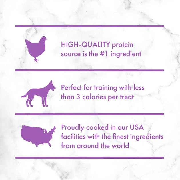 - Real, high-quality chicken is the first ingredient in these bite-sized dog treats.