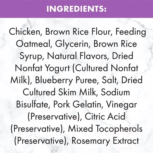 Chicken, Brown Rice Flour, Feeding Oatmeal, Glycerin, Brown Rice Syrup, Natural Flavors, Dried Nonfat Yogurt (Cultured Nonfat Milk), Blueberry puree, Salt, Dried Cultured Skim Milk, Sodium Bisulfate, Pork Gelatin, Vinegar and Citric Acid (preservatives), Preserved with Mixed Tocopherols, Rosemary Extract.