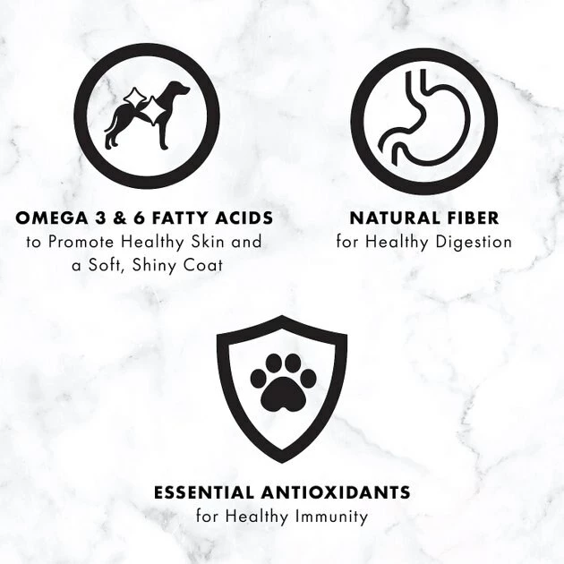 - Omega-3 and omega-6 fatty acids to promote healthy skin and a soft, shiny coat.