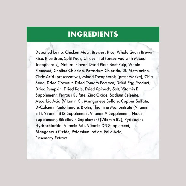 Deboned Lamb, Chicken Meal, Brewers Rice, Whole Grain Brown Rice, Rice Bran, Split Peas, Chicken Fat (preserved with Mixed Tocopherols), Natural Flavor, Dried Plain Beet Pulp, Whole Flaxseed, Choline Chloride, Potassium Chloride, DL-Methionine, Citric Acid (preservative), Mixed Tocopherols (preservative), Chia Seed, Dried Coconut, Dried Tomato Pomace, Dried Egg Product, Dried Pumpkin, Dried Kale, Dried Spinach, Salt, Vitamin E Supplement, Ferrous Sulfate, Zinc Oxide, Sodium Selenite, Ascorbic Acid (Vitamin C), Manganese Sulfate, Copper Sulfate, D-Calcium Pantothenate, Biotin, Thiamine Mononitrate (Vitamin B1), Vitamin B12 Supplement, Vitamin A Supplement, Niacin Supplement, Riboflavin Supplement (Vitamin B2), Pyridoxine Hydrochloride (Vitamin B6), Vitamin D3 Supplement, Manganous Oxide, Potassium Iodide, Folic Acid, Rosemary Extract.