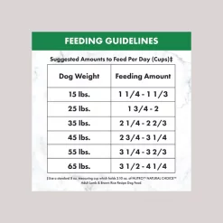 These are the recommended feeding amounts based on the ideal body condition for adult dogs of various weights. Individual dogs’ energy requirements may differ. Adjust the amount fed to obtain or maintain your dog’s optimum weight. Keep fresh drinking water available at all times, provide plenty of exercise and see your veterinarian regularly. Serve dry or lightly moistened.