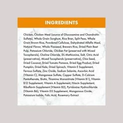 Chicken, Chicken Meal (source of Glucosamine and Chondroitin Sulfate), Whole Grain Sorghum, Rice Bran, Split Peas, Whole Grain Brown Rice, Powdered Cellulose, Dehydrated Alfalfa Meal, Natural Flavor, Whole Flaxseed, Brewers Rice, Dried Plain Beet Pulp, Potassium Chloride, Chicken Fat (preserved with Mixed Tocopherols), Choline Chloride, DL-Methionine, Salt, Citric Acid (preservative), Mixed Tocopherols (preservative), Chia Seed, Dried Coconut, Dried Tomato Pomace, Dried Egg Product, Dried Pumpkin, Dried Kale, Dried Spinach, Vitamin E Supplement, Ferrous Sulfate, Zinc Oxide, Sodium Selenite, Ascorbic Acid (Vitamin C), Manganese Sulfate, Copper Sulfate, D-Calcium Pantothenate, Biotin, Thiamine Mononitrate (Vitamin B1), Vitamin B12 Supplement, Vitamin A Supplement, Niacin Supplement, Riboflavin Supplement (Vitamin B2), Pyridoxine Hydrochloride (Vitamin B6), Vitamin D3 Supplement, Manganous Oxide, Potassium Iodide, Folic Acid, Rosemary Extract.