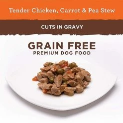 - Nutro Hearty Stew Tender Chicken, Carrot & Pea Stew Grain-Free Canned Dog Food features a savory gravy that dogs love, adding additional moisture to your pup’s diet.