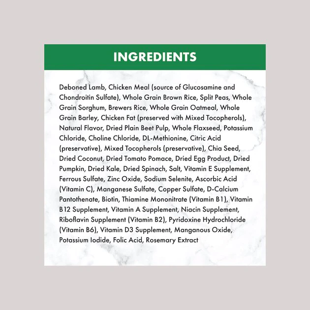Deboned Lamb, Chicken Meal (source of Glucosamine and Chondroitin Sulfate), Whole Grain Brown Rice, Split Peas, Whole Grain Sorghum, Brewers Rice, Whole Grain Oatmeal, Whole Grain Barley, Chicken Fat (preserved with Mixed Tocopherols), Natural Flavor, Dried Plain Beet Pulp, Whole Flaxseed, Potassium Chloride, Choline Chloride, DL-Methionine, Citric Acid (preservative), Mixed Tocopherols (preservative), Chia Seed, Dried Coconut, Dried Tomato Pomace, Dried Egg Product, Dried Pumpkin, Dried Kale, Dried Spinach, Salt, Vitamin E Supplement, Ferrous Sulfate, Zinc Oxide, Sodium Selenite, Ascorbic Acid (Vitamin C), Manganese Sulfate, Copper Sulfate, D-Calcium Pantothenate, Biotin, Thiamine Mononitrate (Vitamin B1), Vitamin B12 Supplement, Vitamin A Supplement, Niacin Supplement, Riboflavin Supplement (Vitamin B2), Pyridoxine Hydrochloride (Vitamin B6), Vitamin D3 Supplement, Manganous Oxide, Potassium Iodide, Folic Acid, Rosemary Extract.