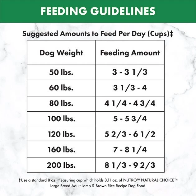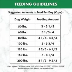 These are the recommended feeding amounts based on the ideal body condition for adult dogs of various weights. Individual dogs’ energy requirements may differ. Adjust the amount fed to obtain or maintain your dog’s optimum weight. Keep fresh drinking water available at all times, provide plenty of exercise and see your veterinarian regularly. Serve dry or lightly moistened.