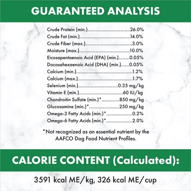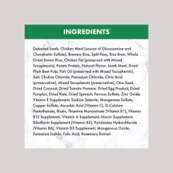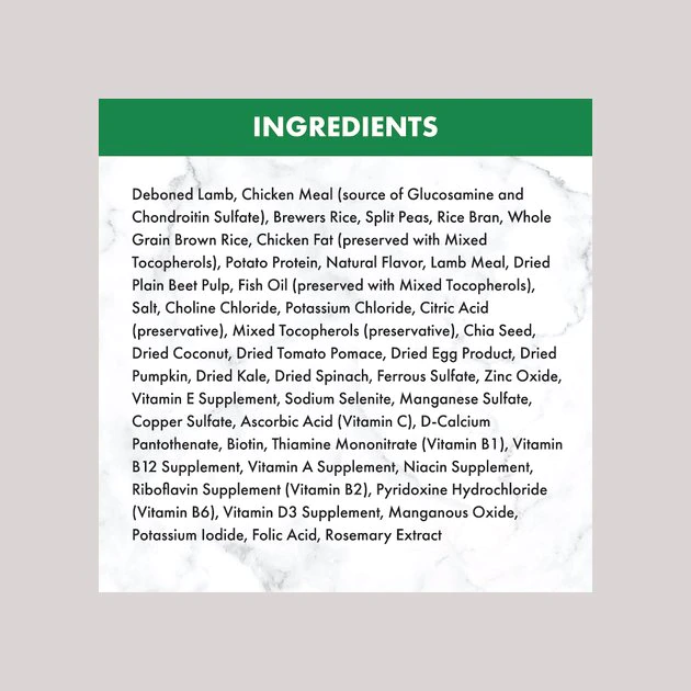 Deboned Lamb, Chicken Meal (source of Glucosamine and Chondroitin Sulfate), Brewers Rice, Split Peas, Rice Bran, Whole Grain Brown Rice, Chicken Fat (preserved with Mixed Tocopherols), Potato Protein, Natural Flavor, Lamb Meal, Dried Plain Beet Pulp, Fish Oil (preserved with Mixed Tocopherols), Salt, Choline Chloride, Potassium Chloride, Citric Acid (preservative), Mixed Tocopherols (preservative), Chia Seed, Dried Coconut, Dried Tomato Pomace, Dried Egg Product, Dried Pumpkin, Dried Kale, Dried Spinach, Ferrous Sulfate, Zinc Oxide, Vitamin E Supplement, Sodium Selenite, Manganese Sulfate, Copper Sulfate, Ascorbic Acid (Vitamin C), D-Calcium Pantothenate, Biotin, Thiamine Mononitrate (Vitamin B1), Vitamin B12 Supplement, Vitamin A Supplement, Niacin Supplement, Riboflavin Supplement (Vitamin B2), Pyridoxine Hydrochloride (Vitamin B6), Vitamin D3 Supplement, Manganous Oxide, Potassium Iodide, Folic Acid, Rosemary Extract.