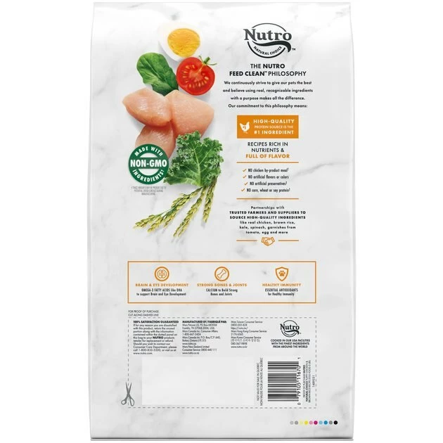 Support those fun park romps and long afternoon walks with Nutro Natural Choice Puppy Dry Dog Food, Chicken & Brown Rice Recipe Dog Kibble. This dry dog food is made with tasty chicken as the very first ingredient, providing a high-quality source of protein. Itโs made with the special dietary needs of puppies in mind, including omega-3 fatty acids to support brain and eye development. Plus, calcium helps support strong bones and joints, and essential antioxidants support a healthy immune system. You can feel good about this recipe made with non-GMO ingredientsโโand thereโs no chicken by-product meal, corn, wheat or soy here!