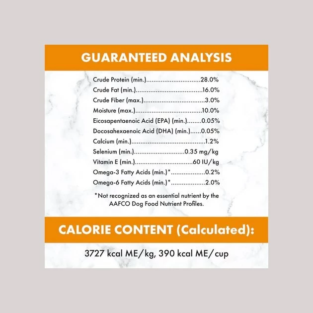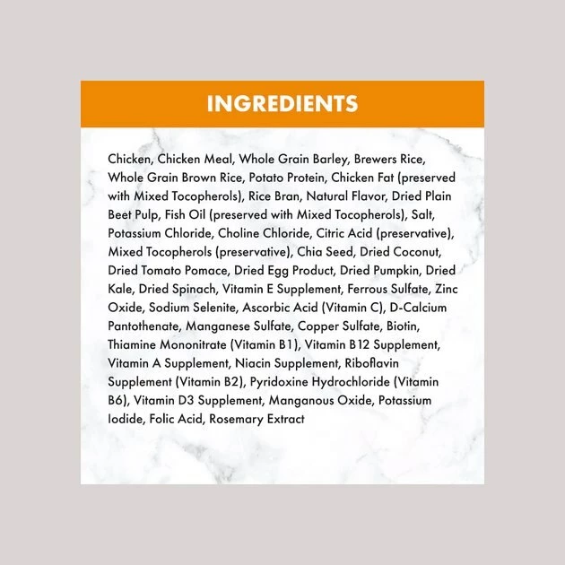 Chicken, Chicken Meal, Whole Grain Barley, Brewers Rice, Whole Grain Brown Rice, Potato Protein, Chicken Fat (preserved with Mixed Tocopherols), Rice Bran, Natural Flavor, Dried Plain Beet Pulp, Fish Oil (preserved with Mixed Tocopherols), Salt, Potassium Chloride, Choline Chloride, Citric Acid (preservative), Mixed Tocopherols (preservative), Chia Seed, Dried Coconut, Dried Tomato Pomace, Dried Egg Product, Dried Pumpkin, Dried Kale, Dried Spinach, Vitamin E Supplement, Ferrous Sulfate, Zinc Oxide, Sodium Selenite, Ascorbic Acid (Vitamin C), D-Calcium Pantothenate, Manganese Sulfate, Copper Sulfate, Biotin, Thiamine Mononitrate (Vitamin B1), Vitamin B12 Supplement, Vitamin A Supplement, Niacin Supplement, Riboflavin Supplement (Vitamin B2), Pyridoxine Hydrochloride (Vitamin B6), Vitamin D3 Supplement, Manganous Oxide, Potassium Iodide, Folic Acid, Rosemary Extract.
