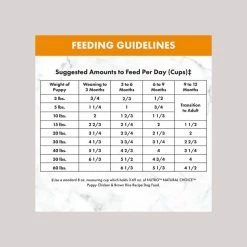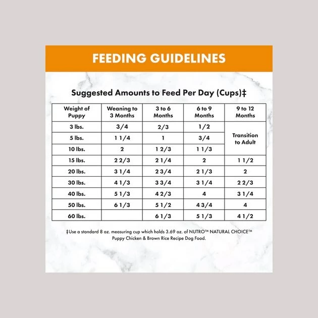 Adjust food to maintain ideal body weight. Always provide fresh drinking water. Puppies up to 6 months: Feed suggested daily amount in 3-4 meals per day. Puppies 6 months to adult: Feed in 2-3 meals per day. Gestation/Lactation: During gestation, feed up to 2 times the amount shown for puppies 6 to 9 months. Feed lactating females as much food as they will eat to maintain weight. Amounts will differ depending on litter size.