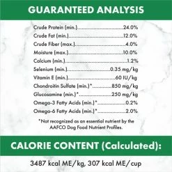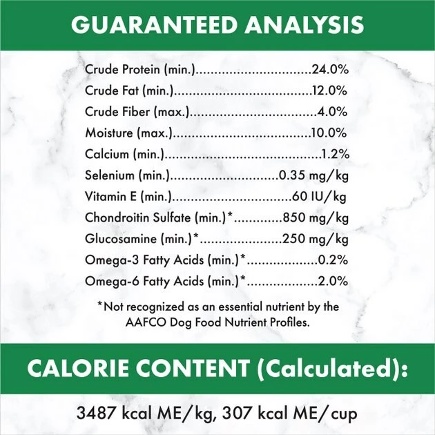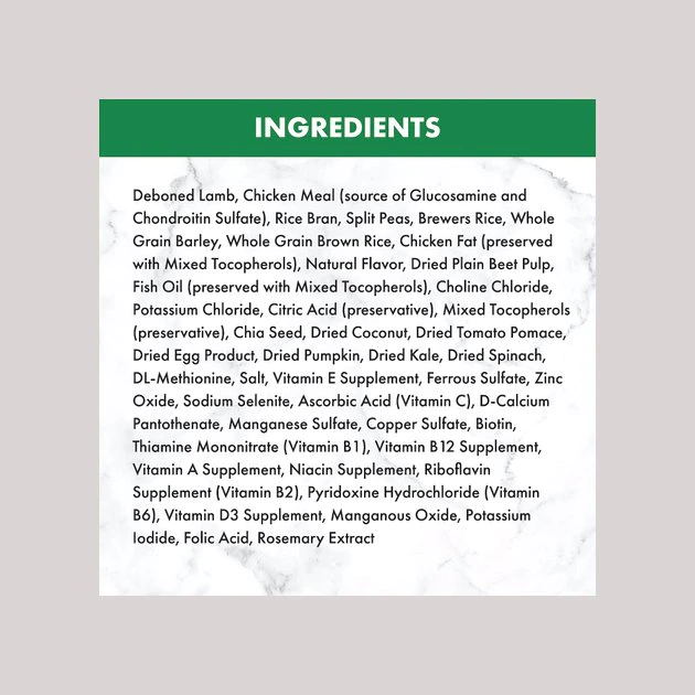 Deboned Lamb, Chicken Meal (source of Glucosamine and Chondroitin Sulfate), Rice Bran, Split Peas, Brewers Rice, Whole Grain Barley, Whole Grain Brown Rice, Chicken Fat (preserved with Mixed Tocopherols), Natural Flavor, Dried Plain Beet Pulp, Fish Oil (preserved with Mixed Tocopherols), Choline Chloride, Potassium Chloride, Citric Acid (preservative), Mixed Tocopherols (preservative), Chia Seed, Dried Coconut, Dried Tomato Pomace, Dried Egg Product, Dried Pumpkin, Dried Kale, Dried Spinach, DL-Methionine, Salt, Vitamin E Supplement, Ferrous Sulfate, Zinc Oxide, Sodium Selenite, Ascorbic Acid (Vitamin C), D-Calcium Pantothenate, Manganese Sulfate, Copper Sulfate, Biotin, Thiamine Mononitrate (Vitamin B1), Vitamin B12 Supplement, Vitamin A Supplement, Niacin Supplement, Riboflavin Supplement (Vitamin B2), Pyridoxine Hydrochloride (Vitamin B6), Vitamin D3 Supplement, Manganous Oxide, Potassium Iodide, Folic Acid, Rosemary Extract.