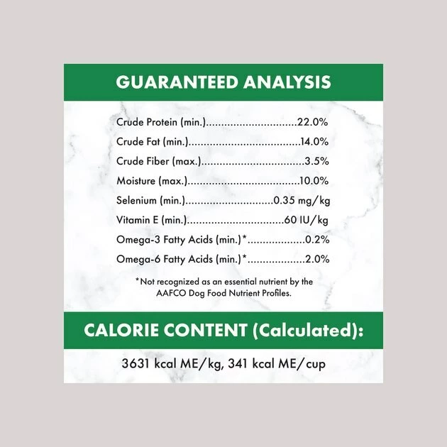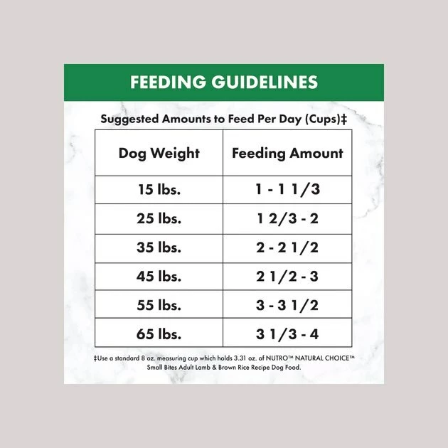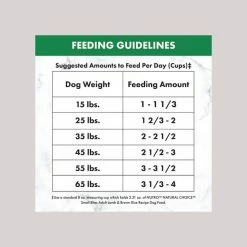 These are the recommended feeding amounts based on the ideal body condition for adult dogs of various weights. Individual dogs’ energy requirements may differ. Adjust the amount fed to obtain or maintain your dog’s optimum weight. Keep fresh drinking water available at all times, provide plenty of exercise and see your veterinarian regularly. Serve dry or lightly moistened.