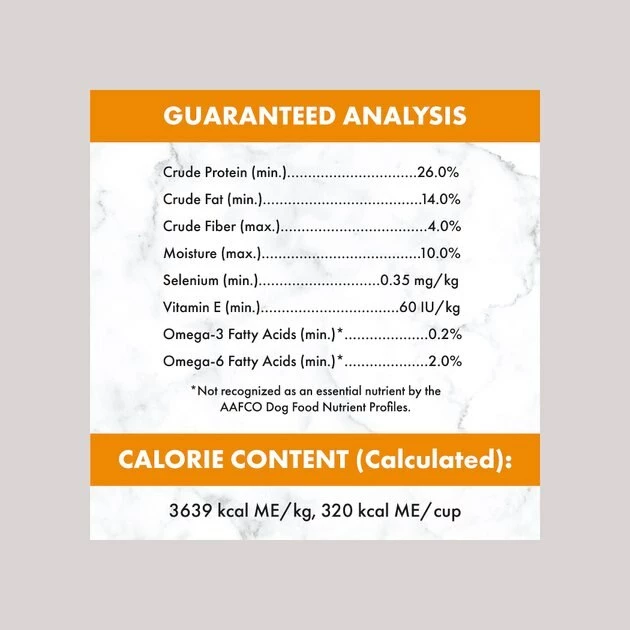 Chicken, Chicken Meal, Whole Grain Barley, Split Peas, Brewers Rice, Whole Grain Brown Rice, Natural Flavor, Chicken Fat (preserved with Mixed Tocopherols), Rice Bran, Whole Grain Oatmeal, Dried Plain Beet Pulp, Fish Oil (preserved with Mixed Tocopherols), Choline Chloride, Potassium Chloride, Citric Acid (preservative), Mixed Tocopherols (preservative), Chia Seed, Dried Coconut, Dried Tomato Pomace, Dried Egg Product, Dried Pumpkin, Dried Kale, Dried Spinach, DL-Methionine, Salt, Vitamin E Supplement, Ferrous Sulfate, Zinc Oxide, Sodium Selenite, Ascorbic Acid (Vitamin C), D-Calcium Pantothenate, Manganese Sulfate, Copper Sulfate, Biotin, Thiamine Mononitrate (Vitamin B1), Vitamin B12 Supplement, Vitamin A Supplement, Niacin Supplement, Riboflavin Supplement (Vitamin B2), Pyridoxine Hydrochloride (Vitamin B6), Vitamin D3 Supplement, Manganous Oxide, Potassium Iodide, Folic Acid, Rosemary Extract.