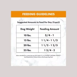 These are the recommended feeding amounts based on the ideal body condition for adult dogs of various weights. Individual dogsโ energy requirements may differ. Adjust the amount fed to obtain or maintain your dogโs optimum weight. Keep fresh drinking water available at all times, provide plenty of exercise and see your veterinarian regularly. Serve dry or lightly moistened.