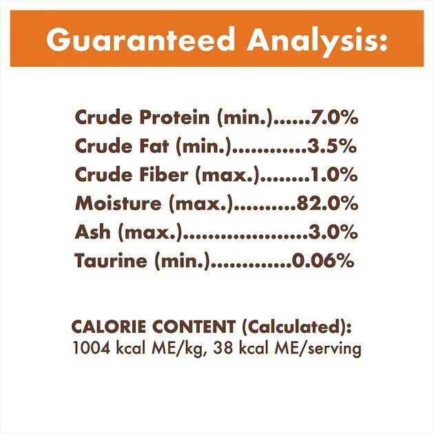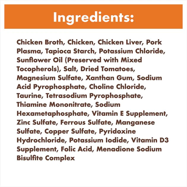 Chicken Broth, Chicken, Chicken Liver, Pork Plasma, Tapioca Starch, Potassium Chloride, Sunflower Oil (Preserved with Mixed Tocopherols), Salt, Dried Tomatoes, Magnesium Sulfate, Xanthan Gum, Sodium Acid Pyrophosphate, Tetrasodium Pyrophosphate, Choline Chloride, Sodium Hexametaphosphate, Taurine, Thiamine Mononitrate (Vitamin B1), Vitamin E Supplement, Zinc Sulfate, Ferrous Sulfate, Manganese Sulfate, Potassium Iodide, Pyridoxine Hydrochloride (Vitamin B6), Copper Sulfate, Vitamin D3 Supplement, Folic Acid, Menadione Sodium Bisulfite Complex (Source of Vitamin K Activity).