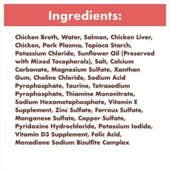 Chicken Broth, Salmon, Chicken, Chicken Liver, Pork Plasma, Tapioca Starch, Potassium Chloride, Sunflower Oil (Preserved with Mixed Tocopherols), Salt, Calcium Carbonate, Magnesium Sulfate, Xanthan Gum, Sodium Acid Pyrophosphate, Tetrasodium Pyrophosphate, Choline Chloride, Sodium Hexametaphosphate, Taurine, Thiamine Mononitrate (Vitamin B1), Vitamin E Supplement, Zinc Sulfate, Ferrous Sulfate, Manganese Sulfate, Potassium Iodide, Pyridoxine Hydrochloride (Vitamin B6), Copper Sulfate, Vitamin D3 Supplement, Folic Acid, Menadione Sodium Bisulfite Complex (Source of Vitamin K Activity).